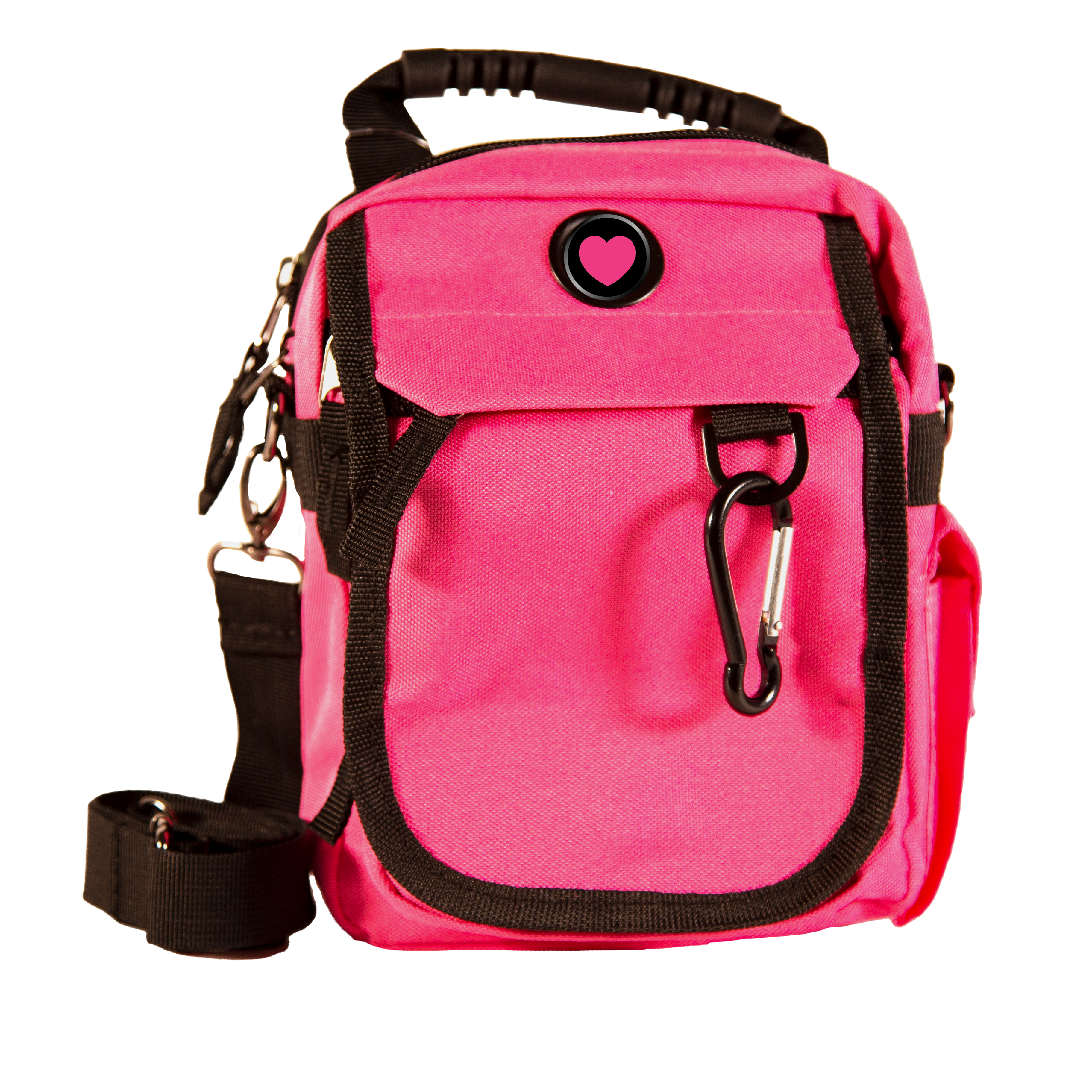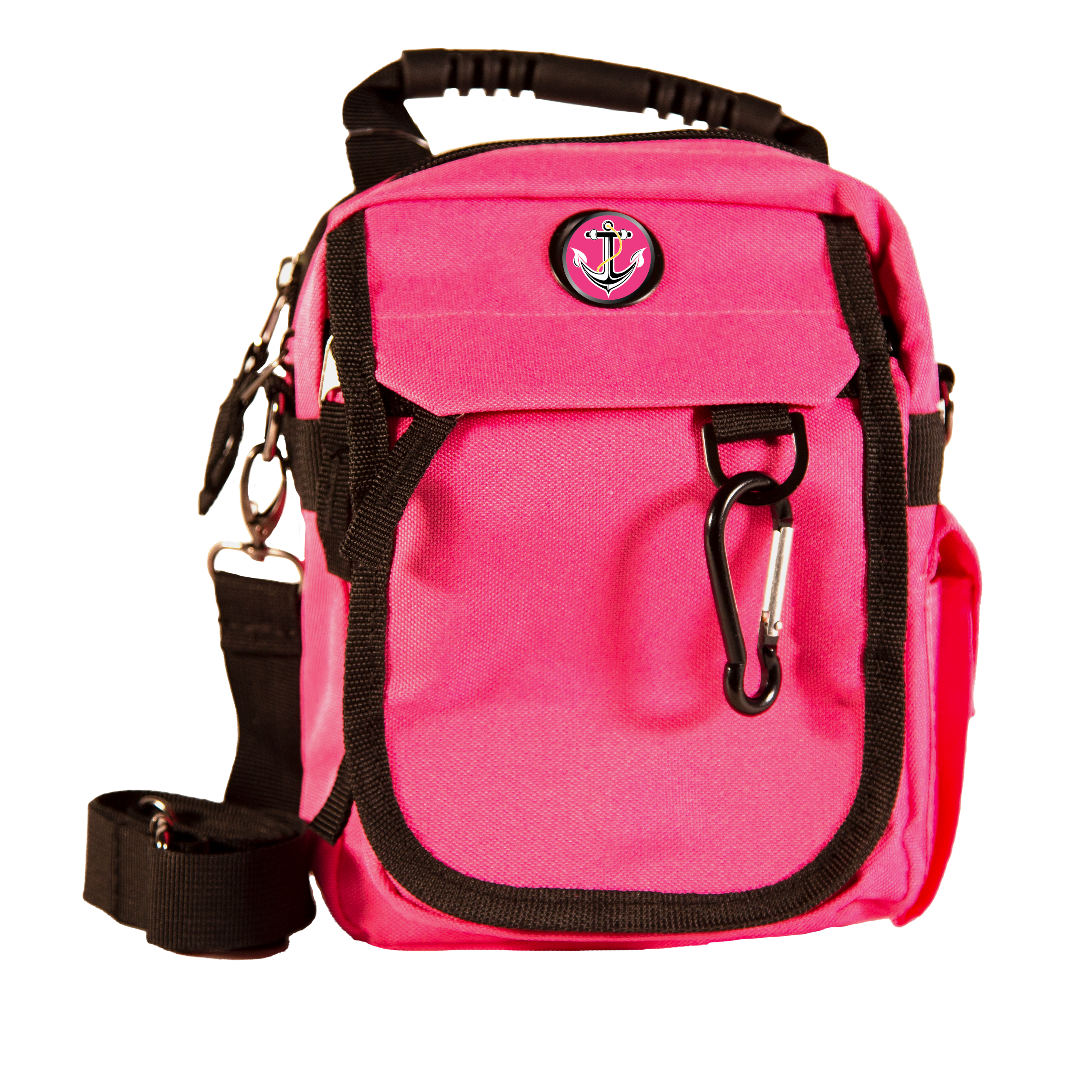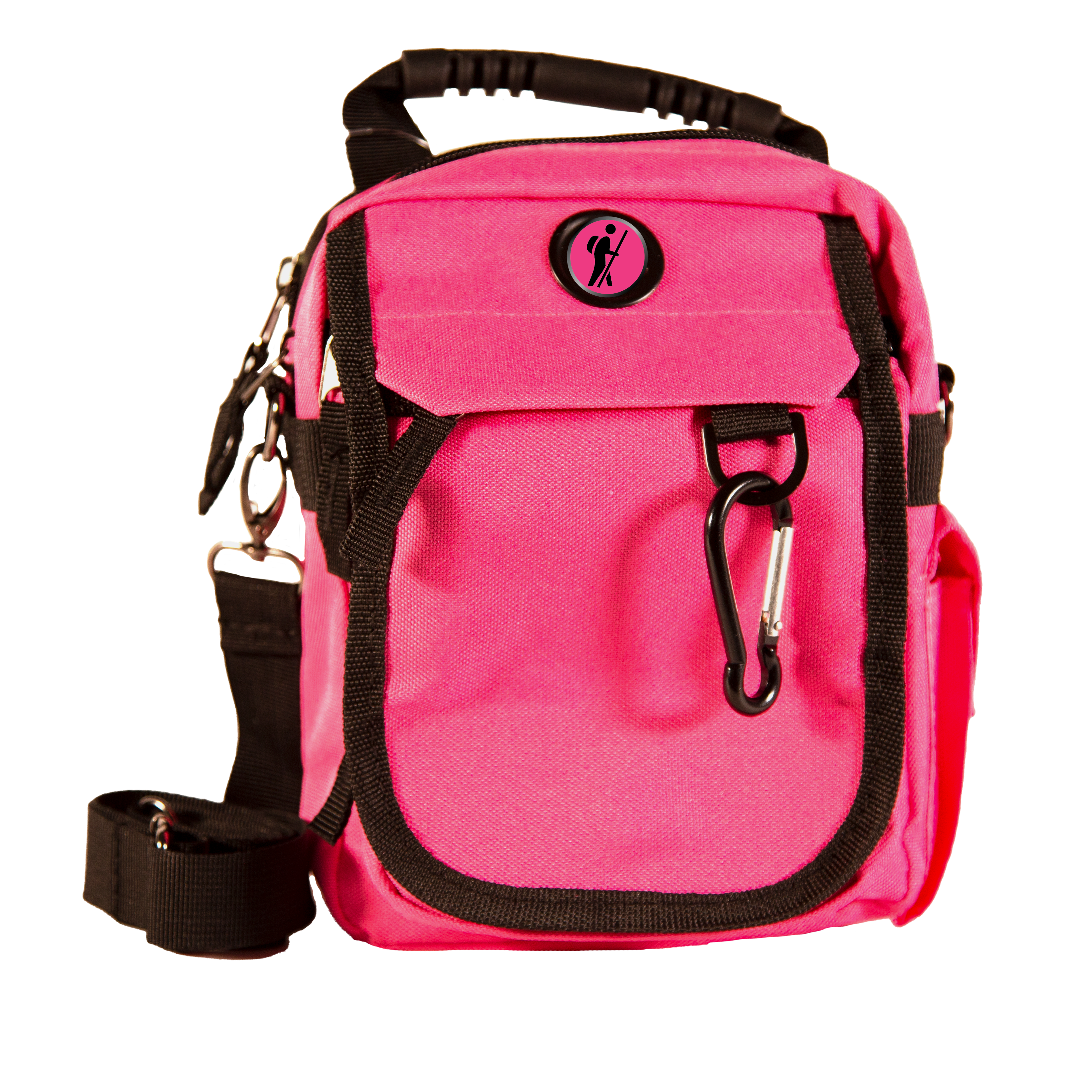 - Handle to carry, carabiner to clip it, or use strap to wear over shoulder, cross chest or on a belt